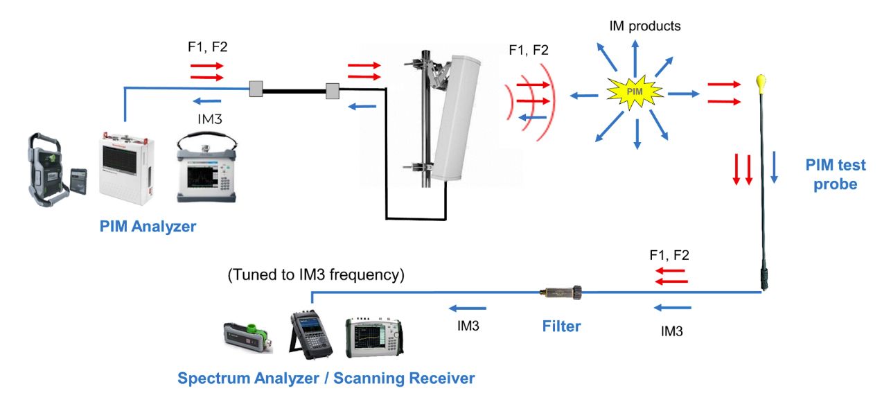 The PIM analyzer illuminates the PIM sources at the site, measures the magnitude of PIM being generated and adds a Distance to PIM (DTP) measurement that can be utilized to aid the hunt. The secondary mobile receiver is tuned to the same IM3 frequency being measured by the PIM analyzer and attached to a PIM Probe. When the probe tip is close to a source, the sound from the receiver becomes stronger. PIM sources can then be hunted like searching for coins on a beach with a metal detector. A bandpass filter is essential between the PIM probe and the spectrum analyzer to prevent the F1 and F2 test tones from mixing within the receiver. Without this filter, high levels of PIM could be generated internally, creating the false impression that PIM is originating from multiple sources.